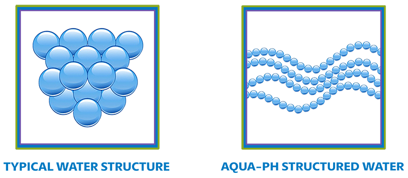 MOLECULAR STRUCTURE OF WATERWhen AQUA-PH is added to any non-chlorinated drinking water the very molecules of the water are restructured, resulting in a more hydrating water. Water is not just a bunch of H2O molecules floating around in liquid form. H2O molecules like to connect to other H2O molecules causing a bond that resembles a bunch of grapes usually containing about 14 to 16 H2O molecules. Typical water restructuring involves breaking these clusters in half. With AQUA-PH the clusters are reorganized into single molecules attached to each other in a structure that would resemble a train. Each water molecule is attached to another, then another in a long string of molecules. This means they enter the cells one at a time which is the smallest possible way leading to maximum hydration* Plus this increase in hydration helps the cells function optimally.